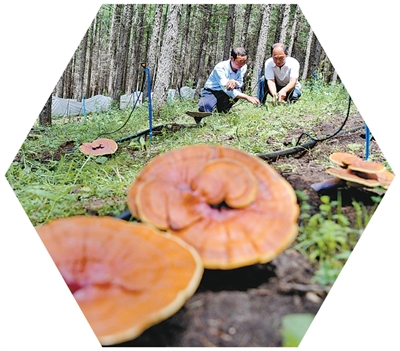 河北省围场满族蒙古族自治县哈里哈镇八十三号村,基地工作人员正查看灵芝长势。