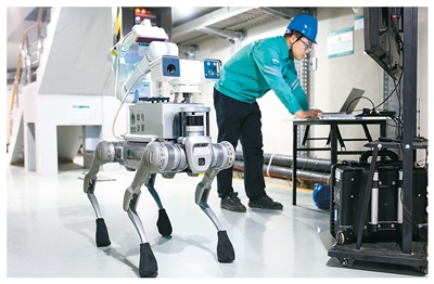 魏子人向记者解释了机器狗的功能。右眼,是可见光镜头,可实时捕捉隧道环境及电缆状态;左眼,是红外成像镜头,可捕捉到温度分布;可伸缩机械臂上面贴片式的传感器可以实现局部放电检测,机器狗还搭载了有毒有害气体识别、温湿度检测装置。