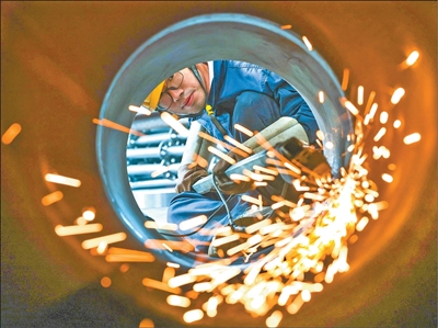 江苏连云港经济技术开发区一家风电设备企业车间内,工人在生产风电塔架。