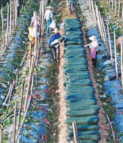 贵州省黔南布依族苗族自治州福泉市凤山镇金凤村冬瓜种植基地,村民忙着采收黑皮冬瓜。
