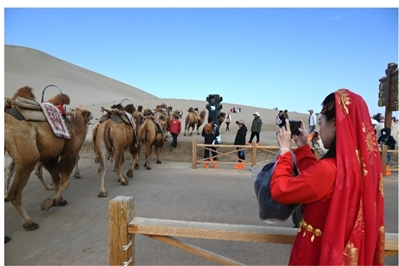 10月5日,在甘肃省敦煌市鸣沙山月牙泉景区,“绿骆驼灯”亮时,农户牵着骆驼有序通过。