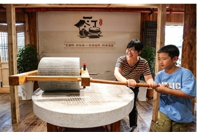10月4日,亲子游客在贵州省遵义市播州区乌江寨体验推石磨。