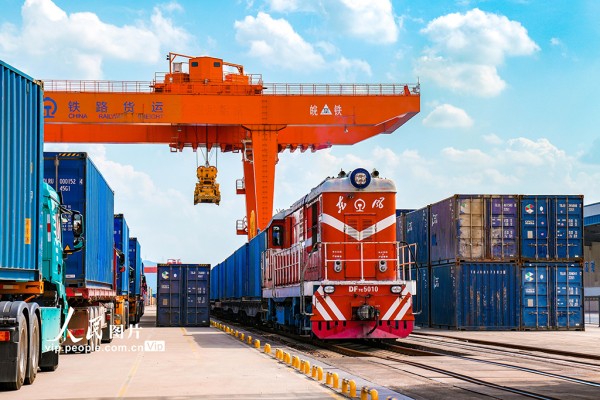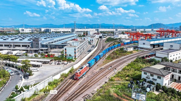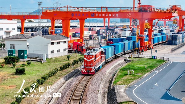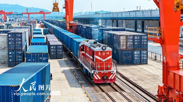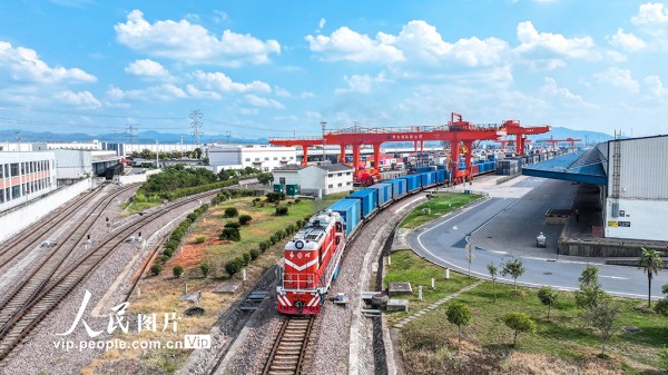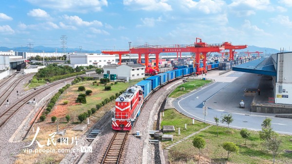 2025年10月2日,一列满载日用百货、五金工具等货物的中欧班列经海关监管后,从浙江省金华市金东区华东国际联运港鸣笛启程,驶向白俄罗斯明斯克。黄文龙摄(人民图片网)