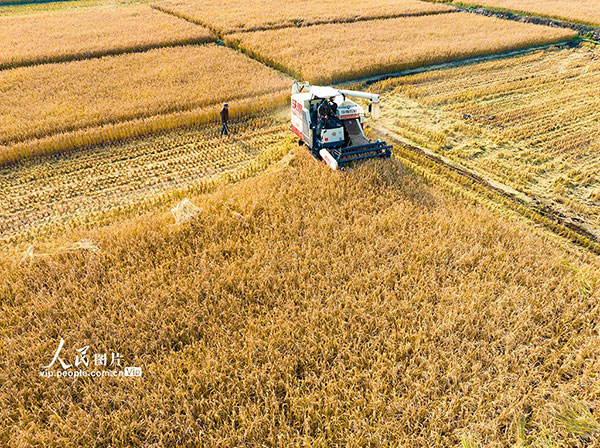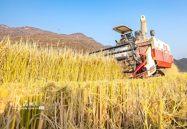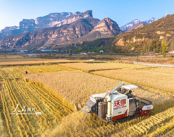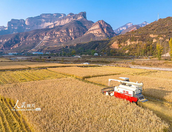 2025年11月3日,山西省晋中市左权县桐峪镇马家楼村的近200亩水稻开镰收割,收割机忙碌作业,田间地头一派繁忙景象。张文军摄(人民图片网)