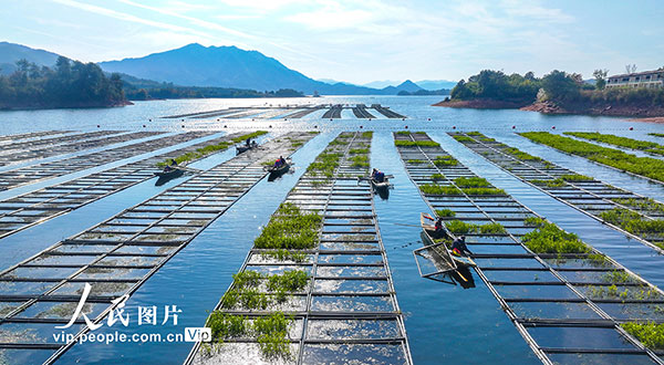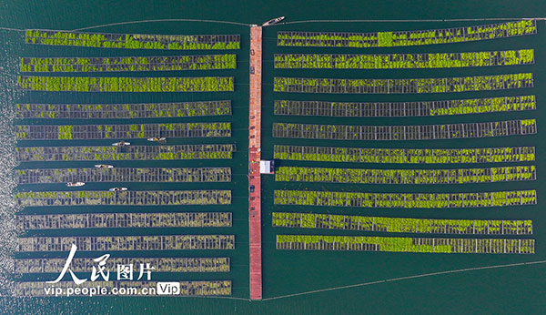 淳安县为保护千岛湖优质水质,积极应用生态浮岛无土栽培技术,筛选根系发达、维护简便、脱氮除磷效率高的水生及驯化陆生植物种植于水面,通过植物密集根系的吸收作用增强水体净化能力,持续提升千岛湖水质。余剑锋摄(人民图片网)