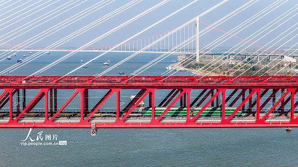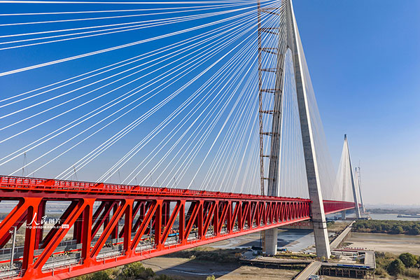 2025年12月3日,安徽马鞍山当涂县巢马城际铁路施工现场,国产WZ500型铺轨机将最后一对500米无缝钢轨铺设到位,标志着巢马城际铁路马鞍山长江公铁大桥主汊航道桥实现轨通,全线铺轨取得重大进展。