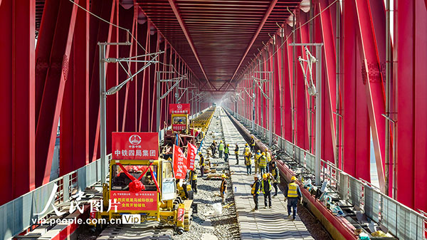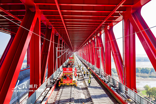 巢马城际铁路北起巢湖东站,南至马鞍山东站,全长约61公里,设计时速350公里,设5座车站。本次采用的国产铺轨机控制精度高、铺设效率快,预计全线铺轨任务将于2026年1月完成。刘玉才摄(人民图片网)