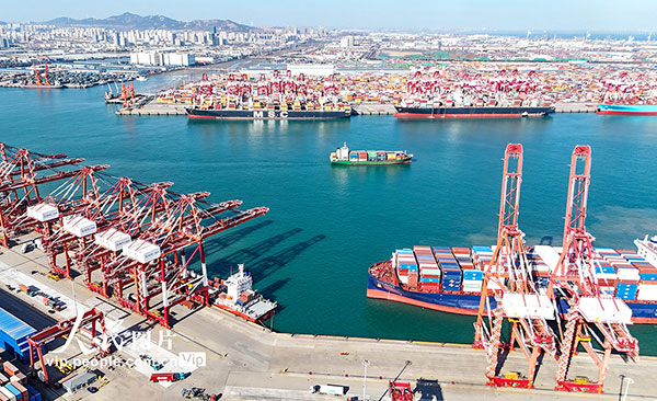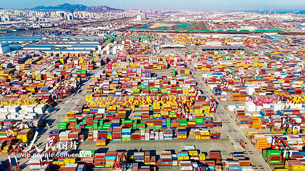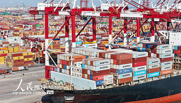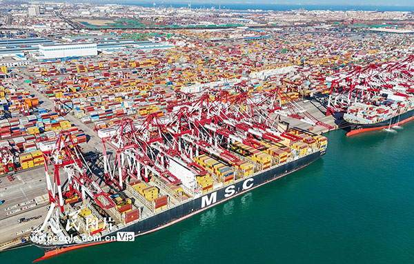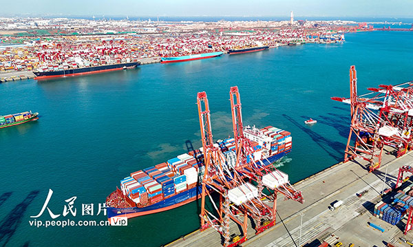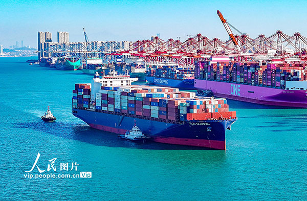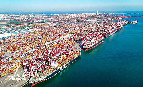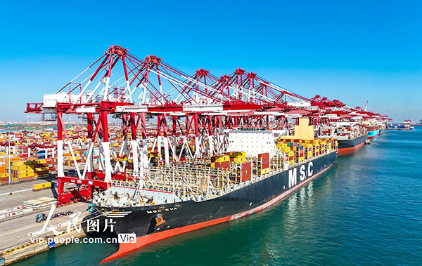 2025年12月8日,随着“地中海伊娃”轮完成装卸作业,山东港口青岛港今年货物吞吐量累计突破7亿吨,国际航运枢纽竞争力稳居东北亚首位。张进刚摄(人民图片网)