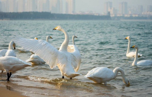 这是12月9日在威海九龙湾拍摄的野生天鹅。