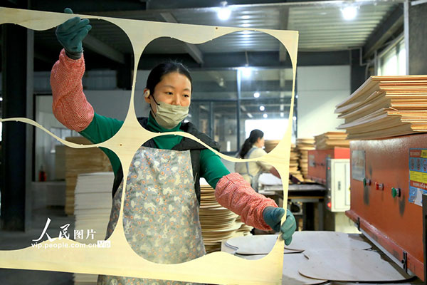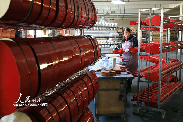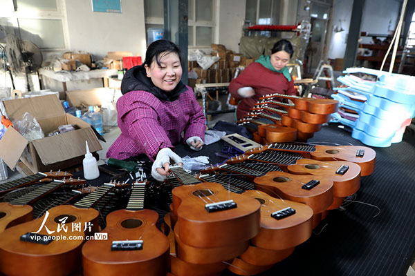 2025年12月21日,在江苏省宿迁市沭阳县桑墟镇刘寨村一家乐器厂内,工人正在加紧生产吉他、尤克里里等乐器。汤以方摄(人民图片网)