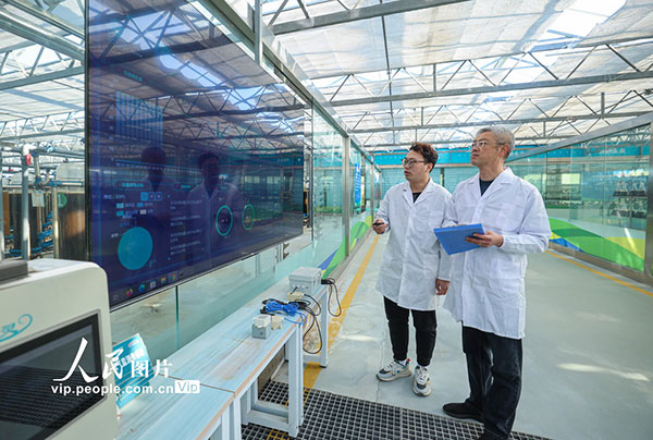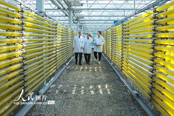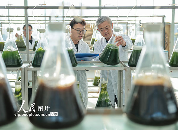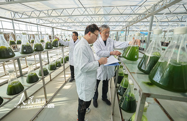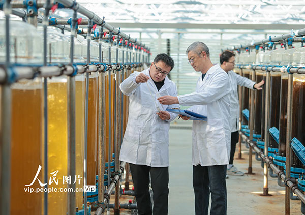 2025年12月24日,山东省荣成市爱伦湾海洋牧场微藻养殖车间内,技术工人在检查微藻繁育情况。该牧场是山东首个海洋牧场“零碳”智慧用能示范区,车间采用现代化智能养殖技术,通过先进传感器实时监测照度、温湿度、水质,联动自动化设备精准调控生长环境,保障微藻最优长势。微藻兼具高经济与生态价值,既是海洋食物链基础,又能固碳助力海洋碳汇,还可广泛应用于食品、医药、生物能源领域。