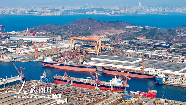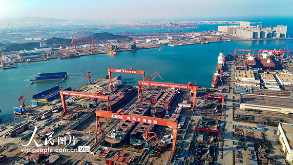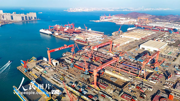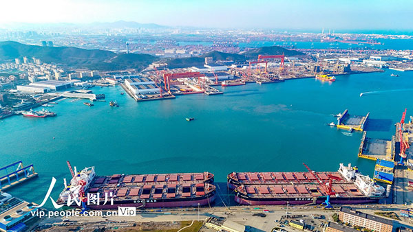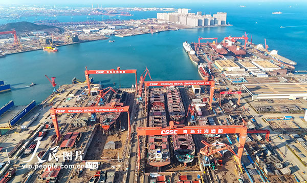2025年12月24日,青岛海西湾船舶海工产业基地一派繁忙,各家企业正全力冲刺年度各项目标任务,为明年生产奠定坚实基础。其中,中国船舶集团青岛北海造船有限公司手持订单70余艘,其中绿色船型占比超90%,国际订单占75%以上,部分排产已至2030年。张进刚摄(人民图片网)