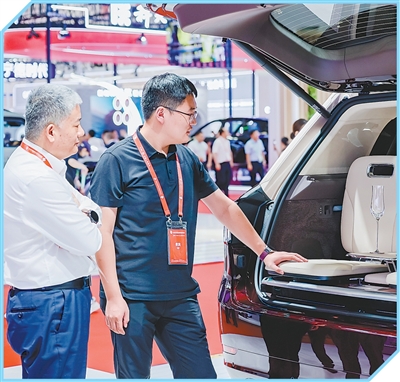 观众在链博会上体验问界M9汽车推出的新型座椅“山海坐席”。