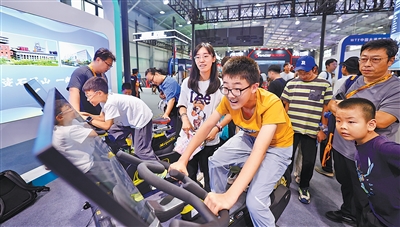 图为9月13日,观众在体育服务专题展区体验智能单车。