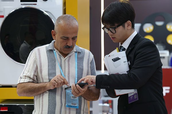10月15日,客商在广交会上咨询了解智能洗衣机。