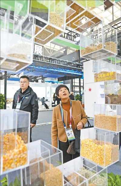 参观者在中国农业科学院展区参观。