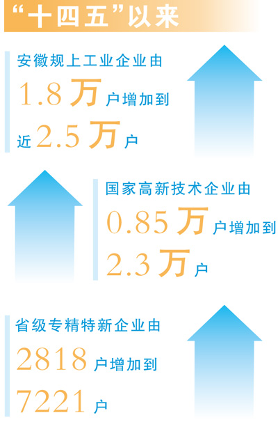 这场从“突围”到“引领”的征程,没有奇迹,只有时间和汗水写下的“争先进位”答案:“十四五”以来,安徽规上工业企业由1.8万户增加到近2.5万户,增长近四成;国家高新技术企业由0.85万户增加到2.3万户,省级专精特新企业由2818户增加到7221户,其中国家级专精特新“小巨人”企业690户。“乔木”参天、“灌木”茁壮、“苗木”葱郁的企业生态初步形成。