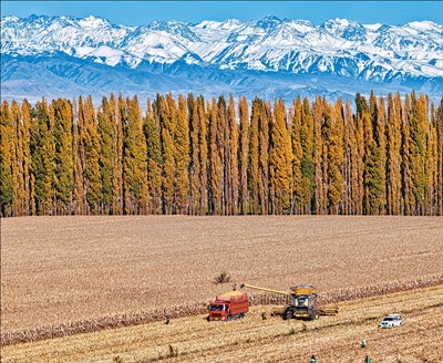图为10月16日,新疆伊犁哈萨克自治州尼勒克县铁热克特村村民正收获玉米。