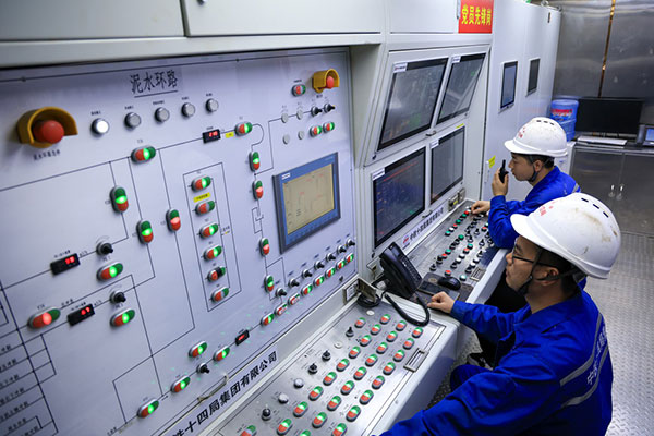 1月6日,中铁十四局施工人员在“深江1号”盾构机操作室控制设备运行。