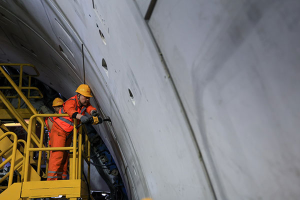 1月6日,中铁十四局施工人员在“深江1号”盾构机上进行管片螺栓紧固工作。