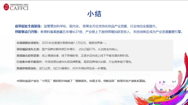 颜江瑛最后表示,“十五五”将是中国化妆品产业实现从全球最大市场向全球产业创新中心历史性跨越的关键五年。行业将在系统性政策改革、消费持续升级与颠覆性技术革命的三重驱动下,完成从规模领先到价值领先、从国内主导向全球布局的深刻转型,书写从“制妆大国”迈向“制妆强国”的时代新篇章。