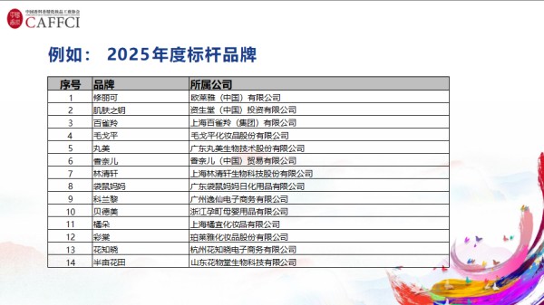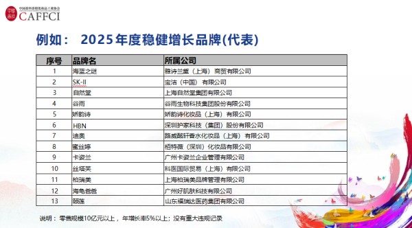 发布会同时公布了2025年度标杆品牌与稳健增长品牌代表,其中标杆品牌需满足2025年度国内零售额位列全行业前50名、年零售规模不低于15亿元、增长率30%以上、无重大违法违规记录等要求,包括百雀羚、毛戈平、丸美等国货品牌及修丽可、肌肤之钥等国际品牌入选;稳健增长品牌代表需满足零售规模10亿元以上、年增长率5%以上、无重大违规记录等要求,包括自然堂、谷雨、HBN等国货品牌及海蓝之谜、SK-II等国际品牌入选,再次呈现理性消费的发展趋势。