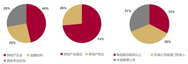 本次调研覆盖约150家行业头部机构,由清华五道口不动产金融研究中心和中国房地产报定向邀请,通过匿名方式参与。如图1,受邀机构包括头部房企、金融机构及其他专业机构,其中机构实控人或集团副总裁及以上职级的受访者占比超过三分之一。样本的采样力求机构分布合理,以保证调研结果的代表性和科学性。