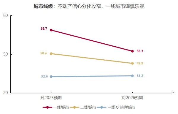 城市线级预期:截至2025年底,受访机构对2026年不同线级城市的市场预期持续分化,但分化差距缩小。图4显示,受访机构的乐观情绪仍聚焦于一线城市,但较上年从68.7下调至52.3的谨慎乐观水平;机构对其他线级城市预期较为保守。