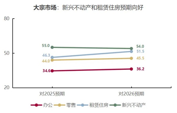 商业不动产大宗市场方面,截至2025年底,受访机构2026年信心持续分化,与新产业、新需求绑定的业态相对蓬勃。图6显示,受访机构对2026年仓储物流、数据中心等新兴不动产和租赁住房类别的预期向好,分别达54.0和51.5,其中租赁住房预期实现了从上年保守向乐观的转变;而零售和办公物业延续上年偏弱预期,但也有所提升。