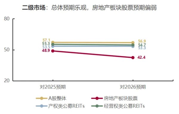 二级市场预期:截至2025年底,2026年机构对二级市场整体延续乐观预期,对地产股信心较为保守。图7显示,受访机构对2026年A股大盘与产权类、经营权类公募REITs的预期保持乐观,而房地产板块股票预期较上年更加保守。这几个指标中,A股整体维持较好预期,产权类、经营权类公募REITs的预期两年间稳步增强。