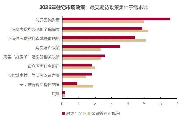 住宅市场政策:受访机构对2026年住宅市场的政策期待聚焦于需求端。图2显示,所有机构共同关注的政策包括放开限购、提高房贷利息抵扣个税幅度,以及下调住房贷款利率或提供贴息【注2】。分机构类型看,房企更期待放开限购及购房落户等政策,反映出其希望解除购房限制以加速去库存的经营导向;金融机构则更关注降息、抵税等财政金融工具,侧重于实质性降低购房成本以增强居民支付能力。