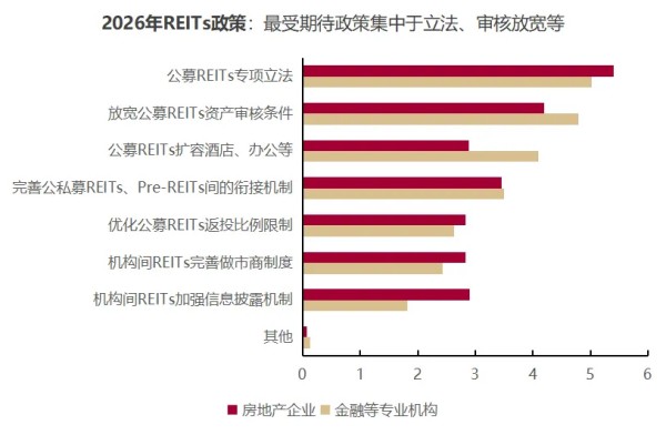 REITs政策:受访机构对2026年REITs市场的政策期待,主要聚焦公募REITs领域。图4显示,所有机构共同关注的议题包括公募REITs的专项立法、放宽资产审核条件、与资产类型扩容等。分机构类型看,房企对公募REITs专项立法的期待度最高,希望简化法律框架以提升存量盘活效率;而金融等专业机构更关注公募REITs放宽审核条件和扩容资产类型,期待通过丰富底层资产和降低发行门槛,进一步增强市场活力与投资灵活性。