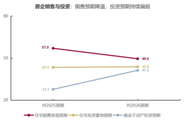 房企销售与投资业务:截至2025年底,受访房企普遍认为2026年所处机构的业务面临挑战,销售与投资业务预期趋向中性(图1)。不同于上年的分化差异,房企对2026年自身各项业务的预期均呈中性偏弱态势【注1】。其对住宅销售预期下调,从偏乐观的57.0下调至49.6;但对住宅与非宅投资业务的预期有所回稳,其中商业不动产投资预期回稳幅度较大,由27.7提升至41.3,逐渐接近其他指标。这表明房企在市场调整背景下,对住宅相关业务的开展更为审慎;随着多层次REITs体系的搭建和不动产金融市场的活跃,房企对商业不动产投资的预期回稳速度快于住宅业务。