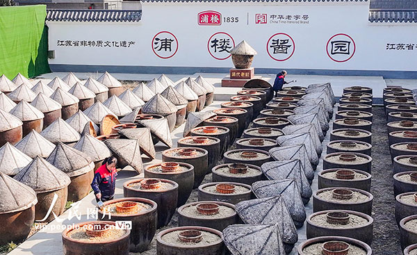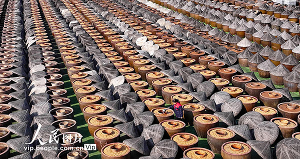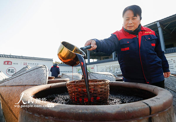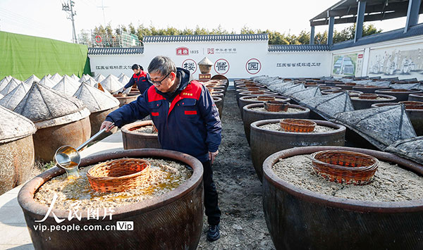 2026年1月8日,江苏淮安浦楼酱醋食品有限公司晒场内,工人正进行淋晒作业。采用古法酿晒的红汤、白汤酱油,酱香浓郁,弥漫在空气中。赵启瑞摄(人民图片网)
