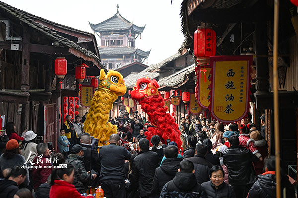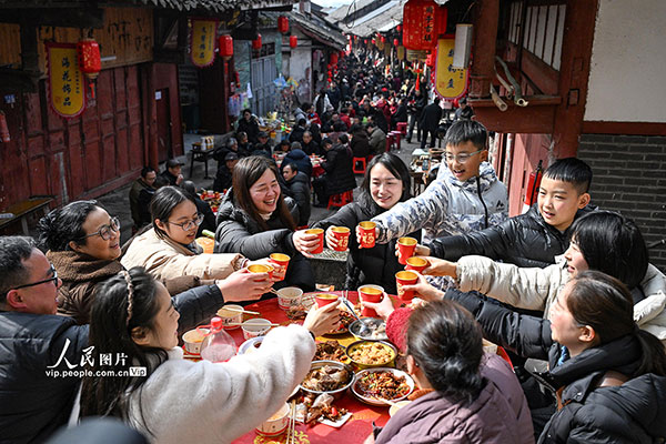 2026年2月10日,四川省南充市蓬安县周子古镇暖意融融,一场由当地居民自发组织的35桌“团年宴”热闹开席,返乡游子和乡亲欢聚一堂,品家乡美食、话邻里温情、共迎马年新春。李向雨摄(人民图片网)