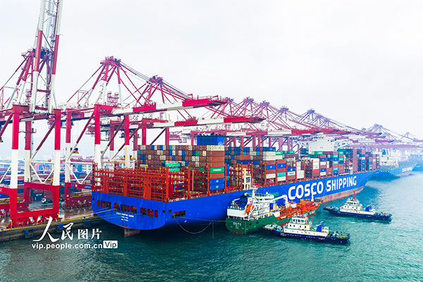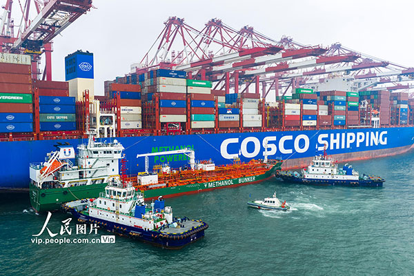 3月3日,山东港口青岛港完成首批两艘国际航行船舶绿色甲醇“船对船”加注作业。此次作业全程不影响码头正常生产,实现了“边作业、边加注”的突破。这标志着青岛港正式成为北方首个实现常态化绿色甲醇加注服务的港口。杨雪梅摄(人民图片网)