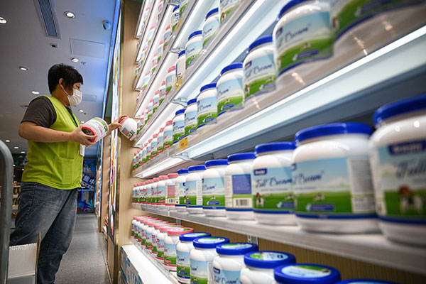 3月12日,工作人员在海口旺豪日用消费品免税店摆放免税奶粉。