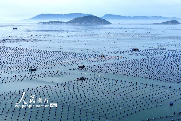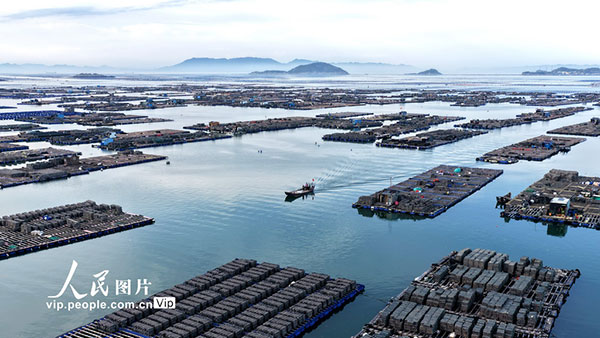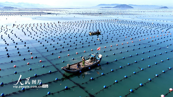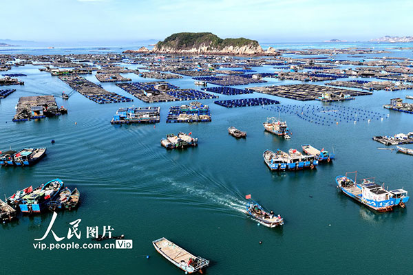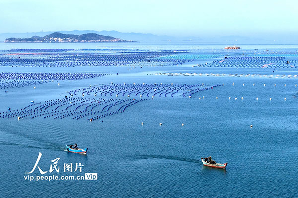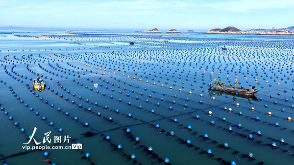 近日,福建省福州市连江县赤才村海域海洋牧场养殖区一派繁忙。养殖工人驾驶渔船穿梭在生态养殖浮筏之间,有序开展投饵、管护、巡查等海上生产作业。王旺旺摄(人民图片网)