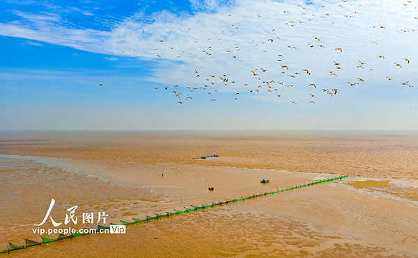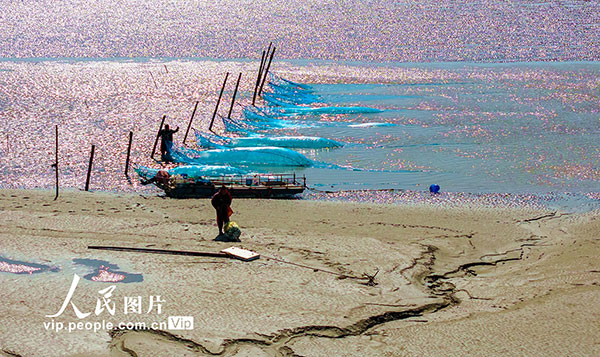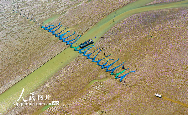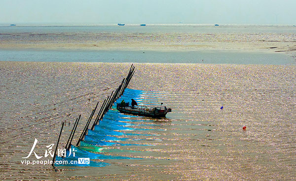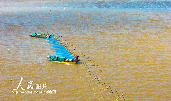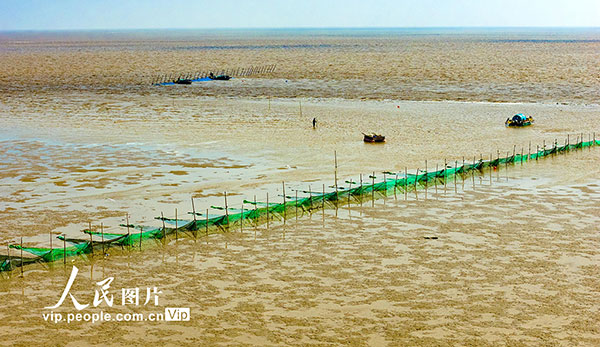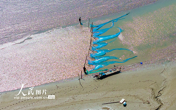 眼下正值一年一度的鳗鱼苗集中捕捞季。在江苏东台沿海条子泥海湾,渔民们正趁着潮汐涨落,抓紧捕捞鳗鱼苗。海边捕鳗作业的场景,成为一道独特的风景。孙家录摄(人民图片网)