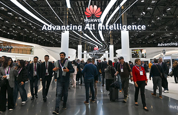 3月2日,在西班牙巴塞罗那,人们在华为展区参观。