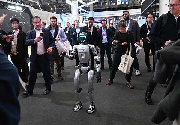 3月2日,在西班牙巴塞罗那,人们围观在展厅行走的人形机器人。