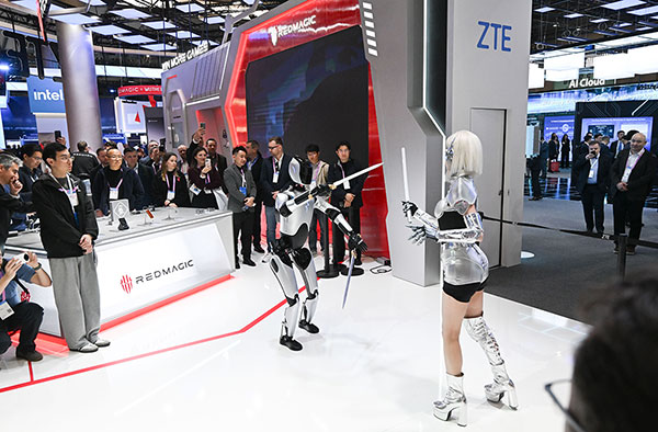 3月2日,在西班牙巴塞罗那,人们在中兴通讯展台观看机器人与真人“对打”。