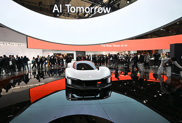 3月2日,在西班牙巴塞罗那,人们参观展台上的小米汽车。