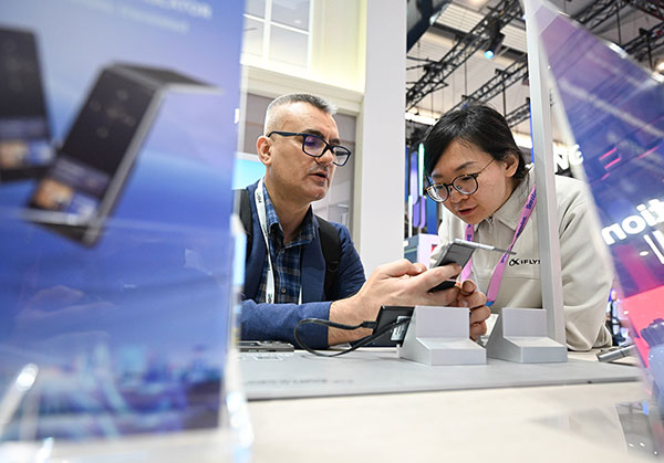 3月2日,在西班牙巴塞罗那,人们在科大讯飞展台体验翻译设备。