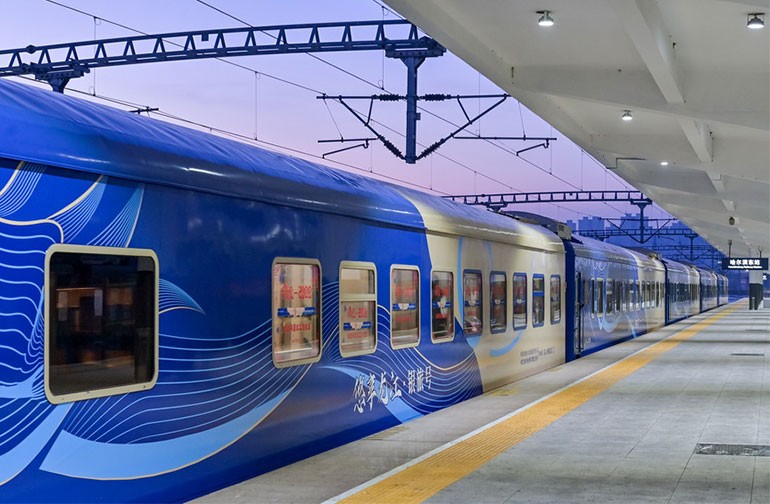 2025年12月28日,在黑龙江哈尔滨开往亚布力的Y999 998次“悠享龙江·银旅号”旅游列车上,随着演艺人员热情高亢的歌声,来自江苏、浙江、上海等地的240名游客开启跨年之旅。