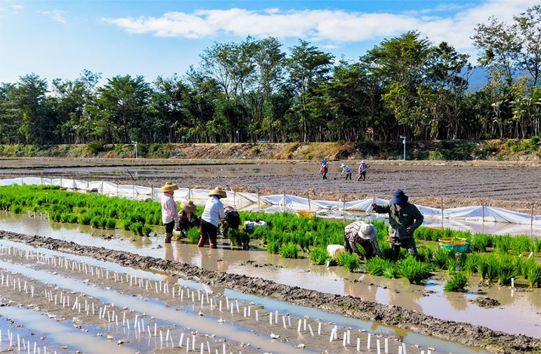 2025年12月20日,国家南繁基地(海南三亚海棠湾片区)青塘村,江苏省南繁中心工作人员在水稻“加代”试验田进行种苗培育与秧苗分类移栽。