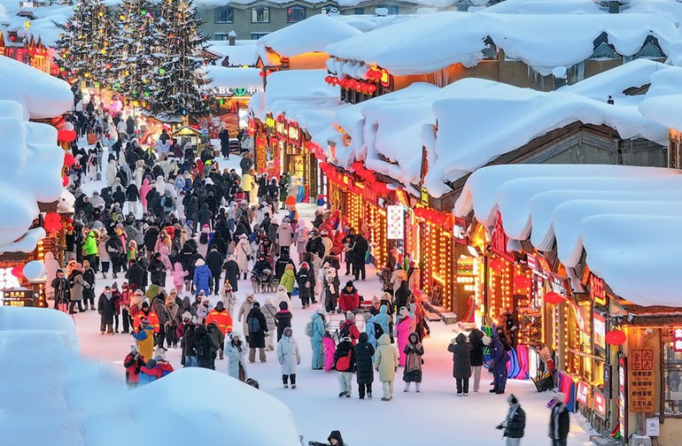 2026年1月17日,黑龙江省海林市,“中国雪乡”景区白雪皑皑,屋檐下冰凌垂挂,红灯笼点缀其间,如梦如幻,宛如童话世界。