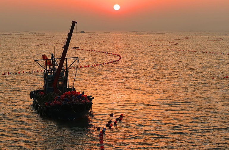 2026年1月27日,山东省日照市山海天旅游度假区,当地渔民驾驶着渔船在海洋牧场收获牡蛎,供应市场。