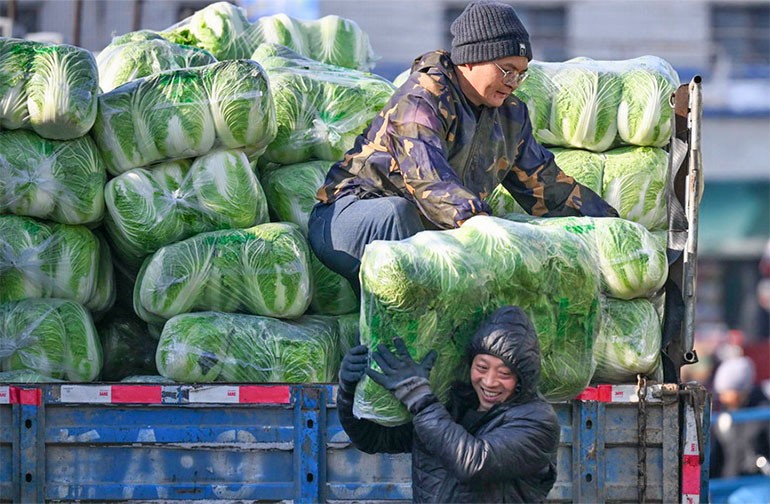 一根扁担,两筐鲜菜,堆得冒尖,不下百斤。冬日清晨6点13分,贵州省黔南布依族苗族自治州惠水县涟江街道王子塘村村委会,村民老曾挑菜来到站台等公交,准备进城卖菜。