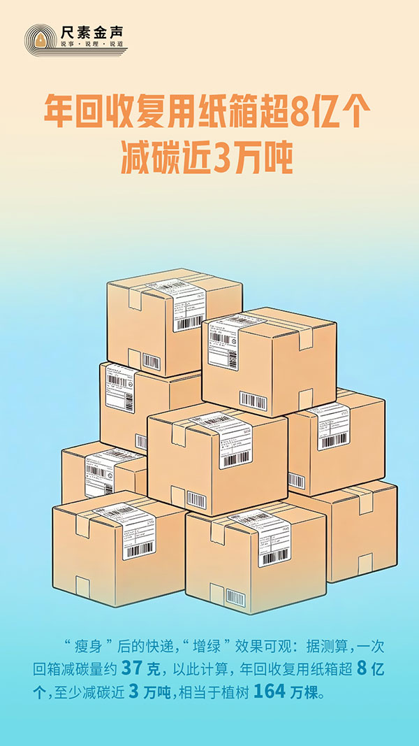 “瘦身”后的快递,“增绿”效果可观:据测算,一次回箱减碳量约37克,以此计算,年回收复用纸箱超8亿个,至少减碳近3万吨,相当于植树164万棵。